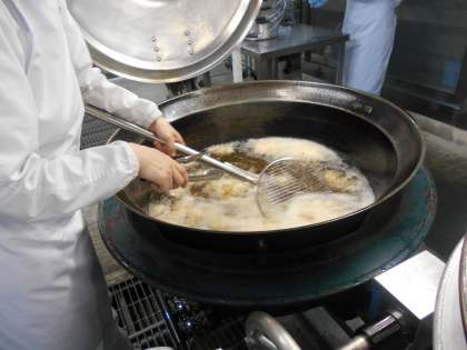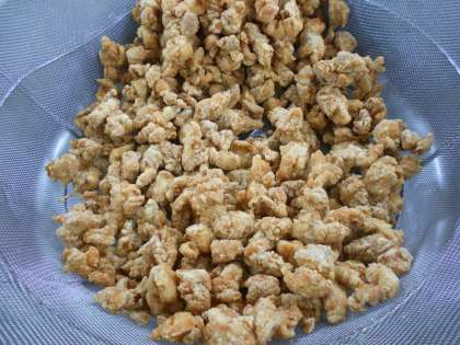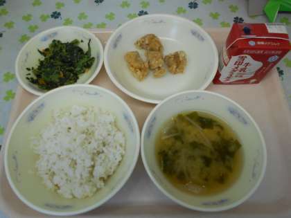 「鶏肉のからあげ」は,鶏肉に塩・こしょう・しょうゆ・料理酒で下味をつけ,米粉と片栗粉をつけて油で揚げて作りました。大人気で,「おいしかったよ!」という感想をたくさん聞くことができました。