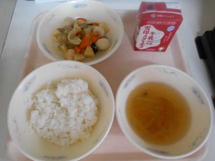 「うずら卵とキャベツのいため煮」は,豚肉・しょうが・にんじん・たけのこ・しいたけを炒めて,キャベツ・うずら卵を入れて煮,水どき片栗粉を入れてとろみをつけました。いろいろな具材をあじわって食べました。