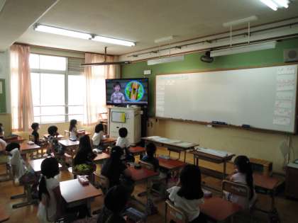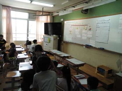 学校できこえてくる,「キンコンカンコン」(チャイムの音)「ピピピピ」(タイマーの音)などの音を声で表すことができました。より面白い表現にするために,いろいろな工夫を見つけることもできました。音の高さを,高くする部分と低くする部分があると面白い。音の長さを伸ばしたり短くしたりすると本当の音に似ている。などと,見つけることができました。