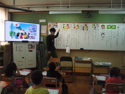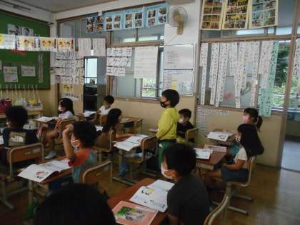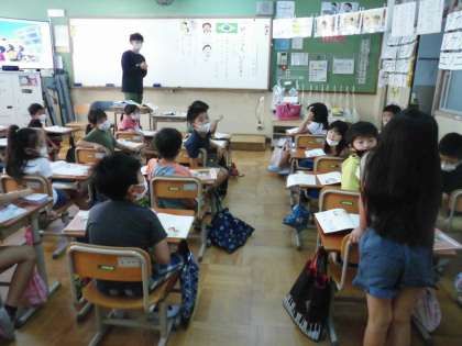 道徳の学習では,「がっこうへいくとき」というお話を通して,せかいのひととつながろうをめあてに学習を進めました。ブラジルからの転入生との関わりの中で,異国の言語を使いながらコミュニケーションをとることで,友情が芽生えるという内容でした。さまざまな言語の「あいさつ」ができたらどんな気持ちになるかを考えることができました。