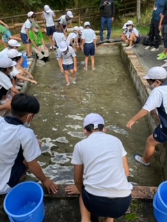 なかなか体験することのできない魚つかみです。一生懸命イワナを追います。