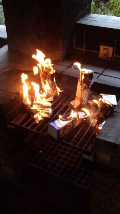 パンをつめた牛乳パックに火をつけて温めます。