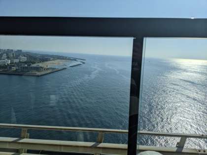 窓の外には,きれいな海が見えています。