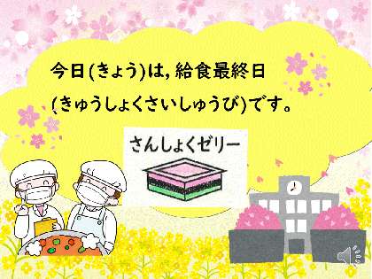 今日は,今年度最後の給食でした。最後なので,特別に三色ゼリーをつけました。大人気の三色ゼリーを喜んで食べてくれていました。