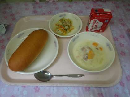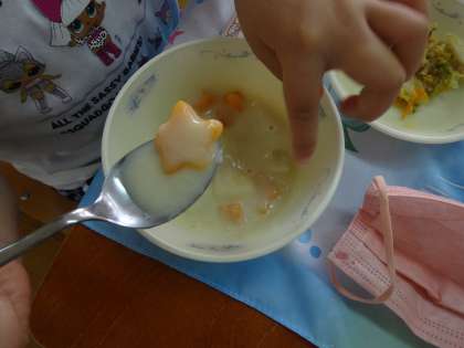 今日のじゃがいものクリームシチューには,星型のにんじんが入っていました。給食調理員さんが,子どもたちに楽しんで食べてほしいと,にんじんを星型に型抜きしました。