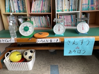 長さ・かさ・重さ を身近に感じることのできる「算数deあそぼう」のコーナーでは、実際に重さや長さをはかる児童の姿がありました。遊びの中から見つけたことで学習に生かすことができることがたくさんあるようです。
