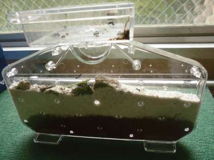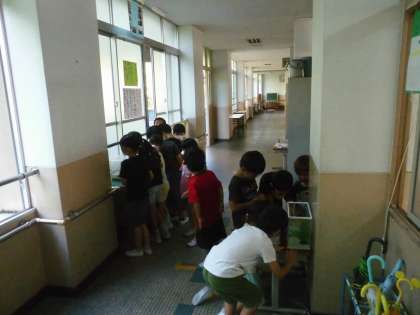 教室の前には、ありの巣を観察できる容器とめだかの水槽が新たに増えました。今日は早速校内のありを捕まえに休み時間活動する姿が見られました。