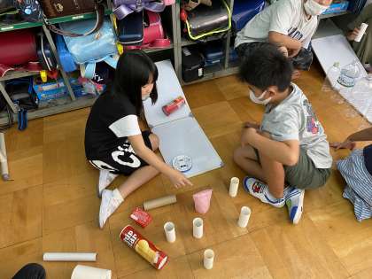素材を使って、いろいろな遊び方を考えます。今日は「ころがす」遊びを考えました。転がしてピンを倒したり、転がしたものをキャッチしたりと各グループが遊びの工夫を考えていました。