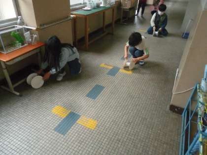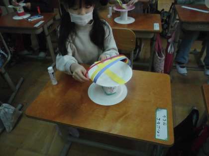 図工の学習では、かみざらを車輪のようにし、転がして遊ぶ作品を制作しています。画用紙の両端をのりで貼り膨らみのある飾りをつくるなど、回った時にどのようになるかを考えながら活動をしています。