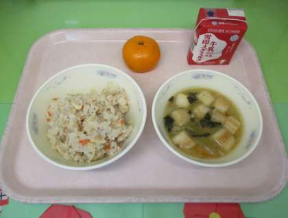 今日の給食は、給食室で保管しておいた米や缶詰などの食材を使って作りました!