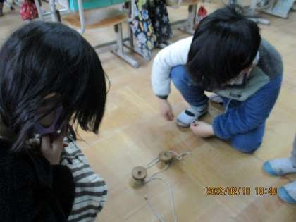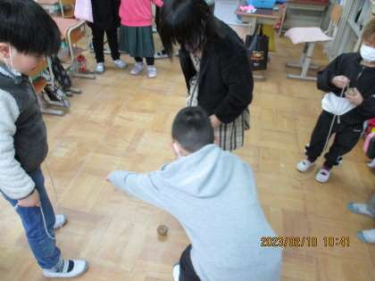雨の日の休み時間の様子です。廊下にあるピアノで教頭先生の伴奏にあわせて歌う姿や、教室内ではコマ遊びをする姿がありました。