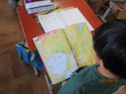 などと予想したことをもとに、地図帳で京都市の様子を調べました。すると、京都市のまわりには海はないけれど、お隣の滋賀県に琵琶湖がある、ということに気付き、京都市の人々は琵琶湖の水を使っているということがわかりました。