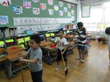 教室のほうきの掃き方、ごみの集め方など、とても丁寧に教えてくれています。