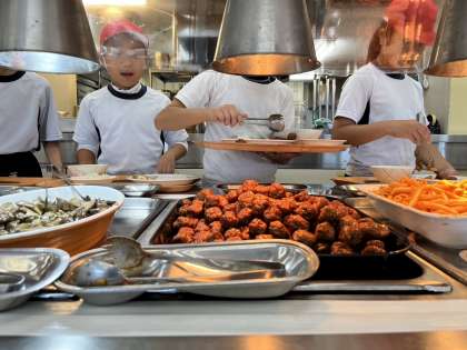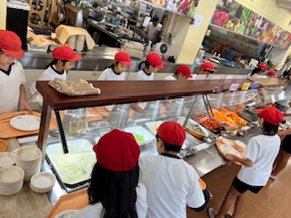 いよいよ,昼食の時間です。昼食は、バイキング方式で、自分の食べるものは自分でお皿に入れていきます。どれもとてもおいしそうで、迷ってしまいます。しっかり食べて,午後からの活度をがんばりましょう。