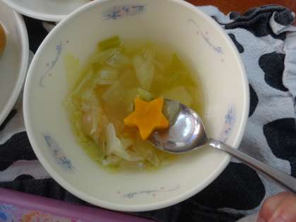 野菜のスープ煮には、じゃがいも・たまねぎ・にんじん・キャベツが入っています。野菜のあまみが味わえるスープ煮です。今日の野菜のスープ煮には、星型のにんじんが入っていたので「星形のにんじんが入ってた」と喜んでいました。