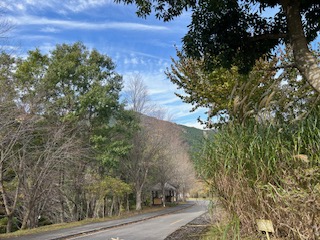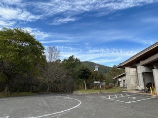 秋の山と美しい青空の下、冒険の森でアスレチックを存分に楽しんだ後は、フライングディスクゴルフです。担任の先生のお話を聞いているところです。