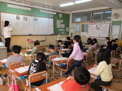 とりわけ元気で明るい一年生。いつも大きな声で手を挙げます。教室の前面には発表するときの言い方,給食,掃除の役割などが整理,掲示されています。このように整った教室の雰囲気のなかで,子どもたちは決まりごとや,それぞれの役割を守り身につけていきます。
