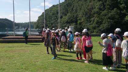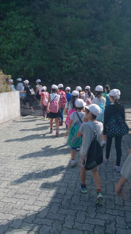 夜に歩くナイトゲームで通る道をみんなで、歩きました。とてもいい天気で気持ちがいいです。2枚目の写真の前方に見えるのが「なかよし港」です。最終日はここから船に乗って帰ります。