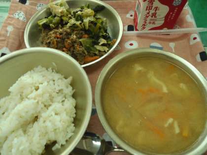 今日の献立は麦ごはん・牛乳・さばそぼろ丼(具)・小松菜とゆばの煮びたし・いものこ汁です。さばそぼろ丼の具をごはんにのせて食べます。1年生も上手に混ぜて食べていました。けずりぶしのだしで炊いたゆばと小松菜を炊いた煮びたしは,初めてゆばを食べる1年生も「柔らかくておいしい」と言っていました。高級食材の京都ならではのゆばを使った献立に,大人も大喜びでした。いものこ汁は,「これは何?」「里芋だよ」「そっか!丸くて柔らかくておいしいな」と感想を聞かせてくれました。
