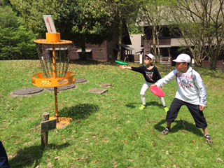 フリスビーを投げて,ゴールのかごに入れる回数を競い合います。