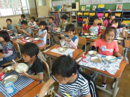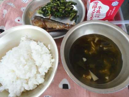 今日の献立はごはん・牛乳・さんまのかわり煮・だいこん葉のいためもの・若竹汁でした。骨のある煮魚は今年度初めてということもあって,各クラスでもう1度「魚の食べ方」を振り返りました。1年生は,自分で上手に骨が取れるかな?と心配しましたが上手に取れる子がたくさんいました。そして,1〜3年生とそよかぜ学級の子どもたちは「お魚名人にチャレンジ!」しました。1〜2年生とそよかぜ学級の児童は何と全員「お魚名人」になりました。上手に魚を食べきったので「お魚名人」の賞状がもらえます。これからも,上手に魚を食べて丈夫な体をつくってほしいと思います。