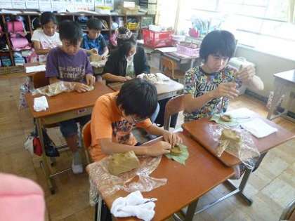 土粘土で作った底の部分ををアジサイの葉っぱの上にのせ,長細く作ったロープ状の物を上に上に重ねていきます。