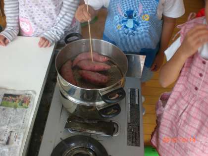 ふれあい農園で掘ってきたサツマイモをふかして食べました。