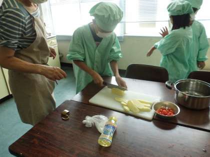 畑で収穫したトマトとジャガイモを使って,みんなで調理実習。