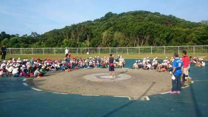 他校の友達と一緒に朝のつどいに参加しています。