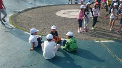 朝のつどいで桃山東小学校のお友達と交流しています。