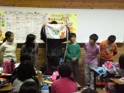 グループで作った班の旗を紹介したり,ゲームを楽しんだりしました。