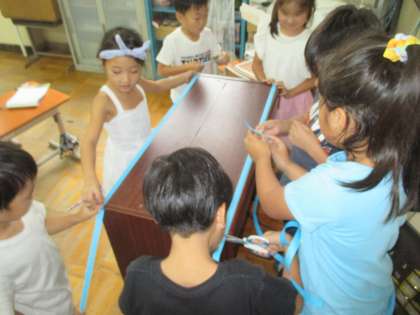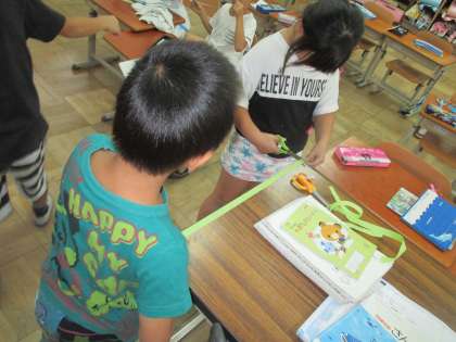 算数の学習で長さ比べをしました。給食台とオルガンは,どちらが長いのか,という問題を,ものさしを使わずに調べました。紙テープで片方の長さを調べ,もう片方の長さにその紙テープをあてて比べるという方法で調べます。みんな楽しみながら活動できました。