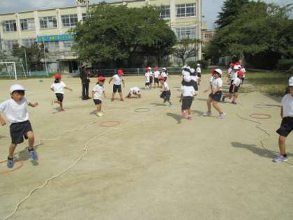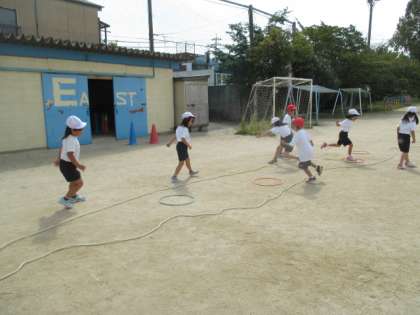 途中,フープの休憩ポイントを使いながら,リズムよく跳び越えていましたよ。