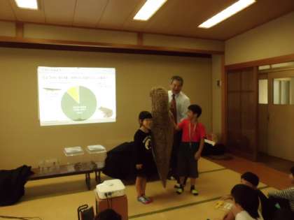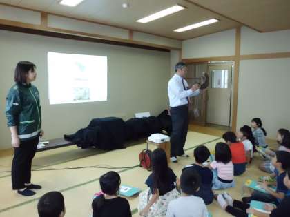 オオサンショウウオの実物大のぬいぐるみは,子どもたちよりも大きくてとても驚いていました。重さもかなりあって,子どもたち4人がかりで持ち上げていました。