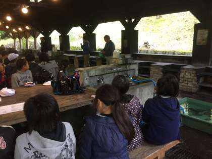 野外炊事の後は,魚つかみです。