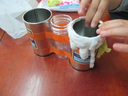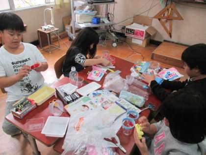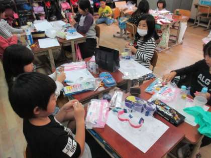 図工では,自分たちが持ち寄った材料を使って,小物入れを作っています。
