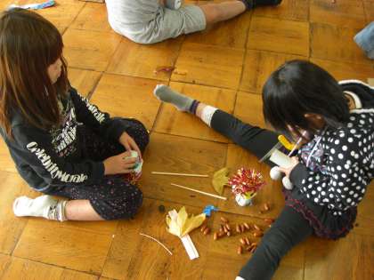 いろいろな種類のどんぐりがあることにとても驚いている様子でした。穴あけ器を使ってどんぐりごまを作ったり,ダンボールカッターを使ってダンボールに穴を空けたりと,新しい道具に興味津々です。マラカスやくじ引きにも秋の飾り付けをして,とても素敵な作品が仕上がりました。毎時間楽しんで活動に取り組んでいます。