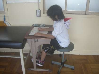 「せんせーい! これってひじ? すりきず?」と体の部分の名前やけがの種類を学びながら一生懸命書いています。