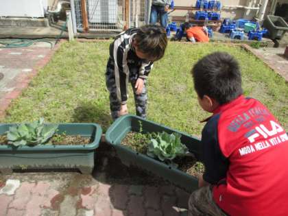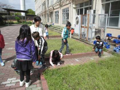 中庭に出て,様々な植物や虫を見付け,観察カードにかきます。