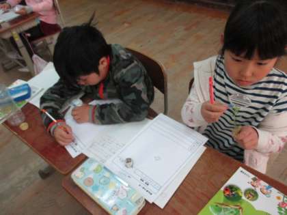 子どもたちは,虫眼鏡を使って「色や形や大きさ」をよく観察し,一生懸命カードにかいていました。