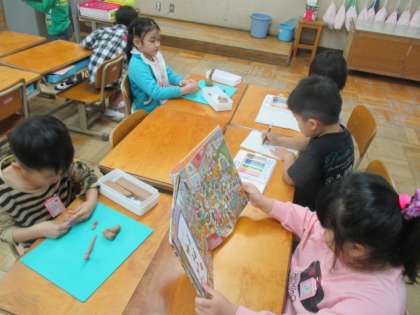 雨の日の休み時間には,教室で本を読んだり,粘土で遊んだり,自由帳に絵を描いたり,図書室に本を借りに行ったりしています。