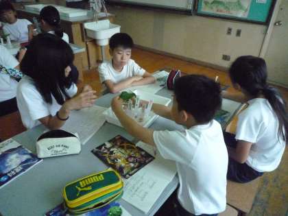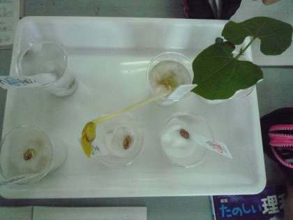 水,空気,温度の条件を変えてインゲンマメを育て,発芽の条件を調べました。