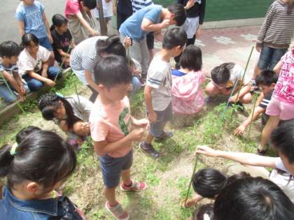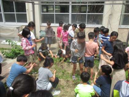 今日の総合の時間に,以前植えた「りりこトマト」の周りに支柱を立てました。
