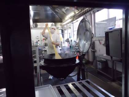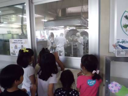 給食室の見学では、給食調理員さんの手際のよい作業にびっくりしていました。お釜や木べらの大きさにも驚いていましたよ。