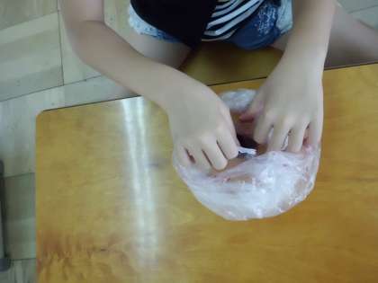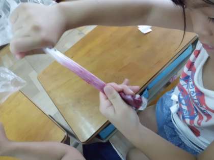 今日は,あさがおの花をしぼって色水をつくり,和紙を染めてあそびました。