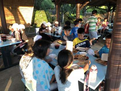 今夜のキャンプファイヤーに向けて,エネルギー補給中です。