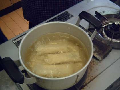 2月3日は、中国のお正月、「春節」の日。日本語教室では、1年生から6年生まで全員が集まって、「春節」に食べる習慣のある「バナナ春巻き」を作りました。まず、バナナを横に半分切ります。この切ったバナナが一つ分の春巻きになります。そして、縦にもう半分バナナを切り、間にたっぷりあんこをはさみこみます。あとは、ていねいに春巻きの皮で包み、油で揚げれば出来上がり。