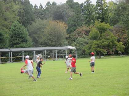 広い芝生広場で,すもうや鬼ごっこをして,元気よく遊んでいました。