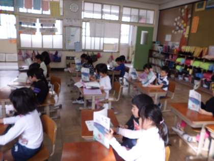 来週から使う新しい教科書(国語「下」)を配りました。名前を書いた後ふと見ると,みんな真剣な顔で,気になったページを読んでいるではありませんか!本は「心の栄養」といいます。たくさんの本を読んで,いろいろな世界を味わって,多くの言葉を知ってほしいな。