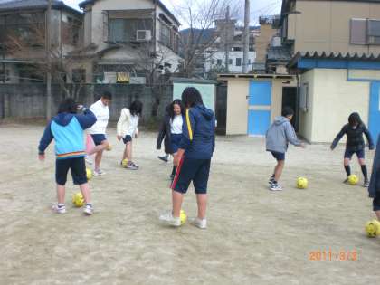 自分のボールをドリブルしながらキープし,相手のボールを蹴り出すゲームやチームに分かれての試合を楽しみました。